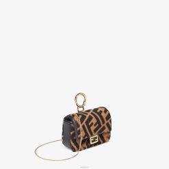 icónico bolso baguette en versión nano, con solapa y cierre ff con cierre magnético. el clip permite sujetarlo a bolsos o cinturones más grandes. También se puede llevar cruzado gracias a la fina bandolera de cadena. forro con bolsillo plano. Confección en borreguito rasurado con estampado ff en color marrón y tabaco. Bordes acabados con adornos de cuero negro. artículos de metal con acabado dorado.