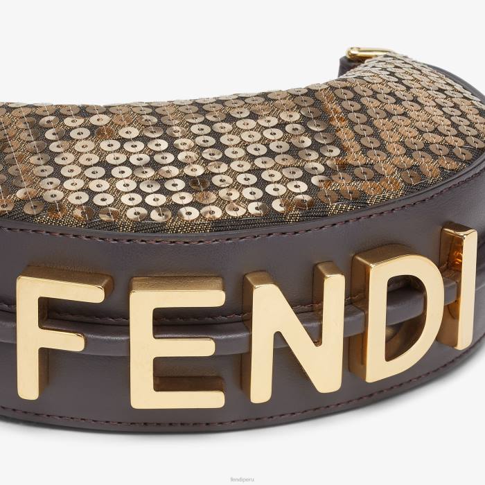 Bolso hobo nano fendigraphy con cierre de cremallera, adornado con letras fendi vintage de metal dorado. la correa ajustable con clip permite sujetarlo a bolsos más grandes o llevarlo en la muñeca. Viene con ganchos para la correa para el hombro. Confeccionado en tejido jacquard ff con bordado de lentejuelas. Detalles en piel marrón oscuro. Accesorios de metal con acabado dorado vintage.