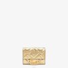 Cartera baguette continental con cierre de botón a presión. espacioso y bien organizado, con dos bolsillos con fuelle, un bolsillo con cremallera, diez ranuras para tarjetas y dos bolsillos laterales planos. Realizado en piel laminada dorada. rematado con motivo ff en relieve. artículos de metal con acabado dorado.