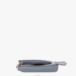 F es un llavero fendi con laterales reforzados. el reverso tiene cuatro ranuras para tarjetas. En el interior hay una correa extraíble con clip. cierre de cremallera. Confección en piel cuoio romano azul claro. Artículos metálicos con acabado en paladio.