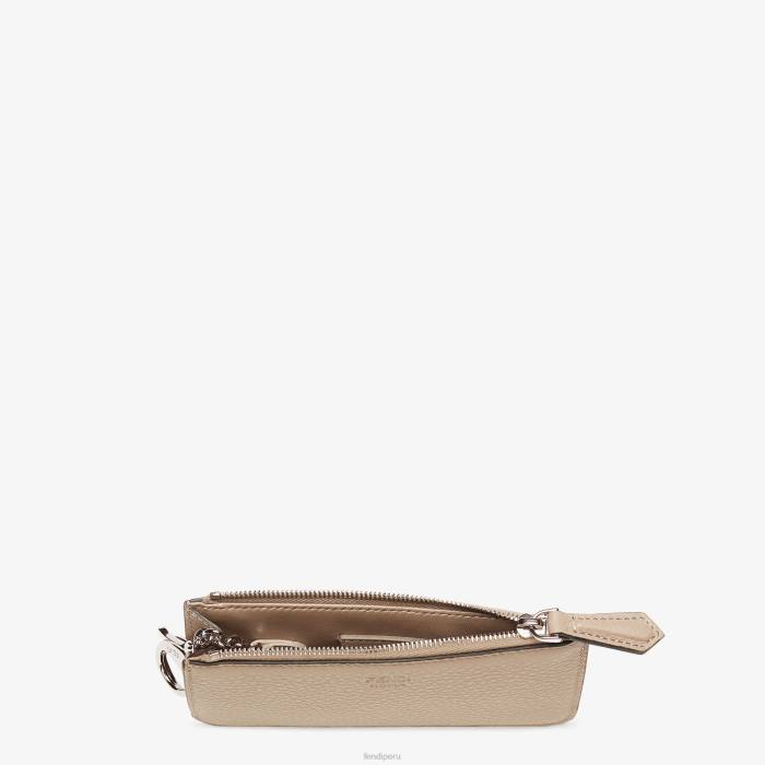 F es un llavero fendi con laterales reforzados. el reverso tiene cuatro ranuras para tarjetas. En el interior hay una correa extraíble con clip. cierre de cremallera. Confección en piel cuoio romano beige. Artículos metálicos con acabado en paladio.