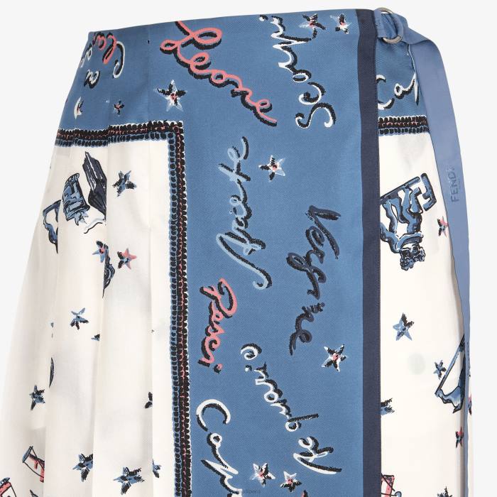 Falda midi cruzada de corte recto y corte A. confeccionado en seda azul y blanca con el motivo astrológico de Fendi estampado por todas partes. el panel frontal se fija lateralmente con un cordón de tejido jacquard y una anilla de metal.