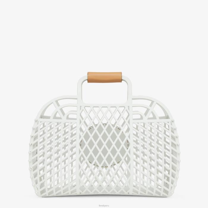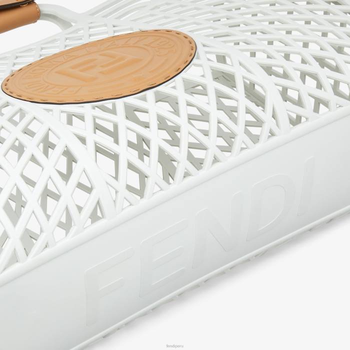 Bolso de mano de tamaño mediano fabricado íntegramente en plástico reciclado de color blanco, decorado con un sello fendi de piel repujado en color marrón claro.