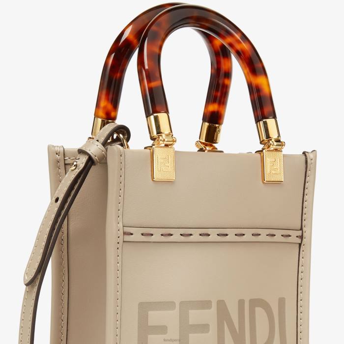 Bolso shopper mini Sunshine confeccionado en piel gris tórtola con fendi roma estampado en caliente y asas rígidas de plexiglás con efecto carey.