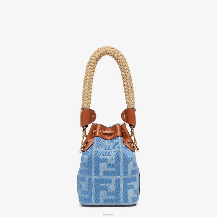 Bolso bombonera pequeño mon tresor confeccionado en denim azul claro con motivo ff tono sobre tono con bordado en relieve y ribete de piel marrón.