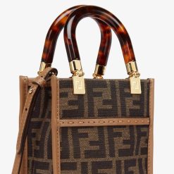 Bolso shopper mini Sunshine confeccionado en tejido jacquard ff marrón con asas rígidas de plexiglás efecto carey.