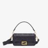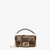 Minibolso con solapa confeccionado en piel con motivo ff grabado a mano en color marrón y negro. decorado con el icónico cierre de presión ff.