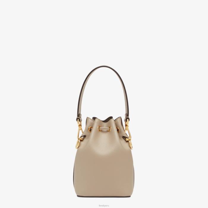 Bolso tipo bombonera pequeño con cierre de cordón y adornos metálicos con el logo de Fendi. El bolso tiene dos correas de hombro desmontables, una larga y otra corta, para llevar el bolso al hombro o cruzado. Confeccionado en piel de becerro color beige. orfebrería dorada.