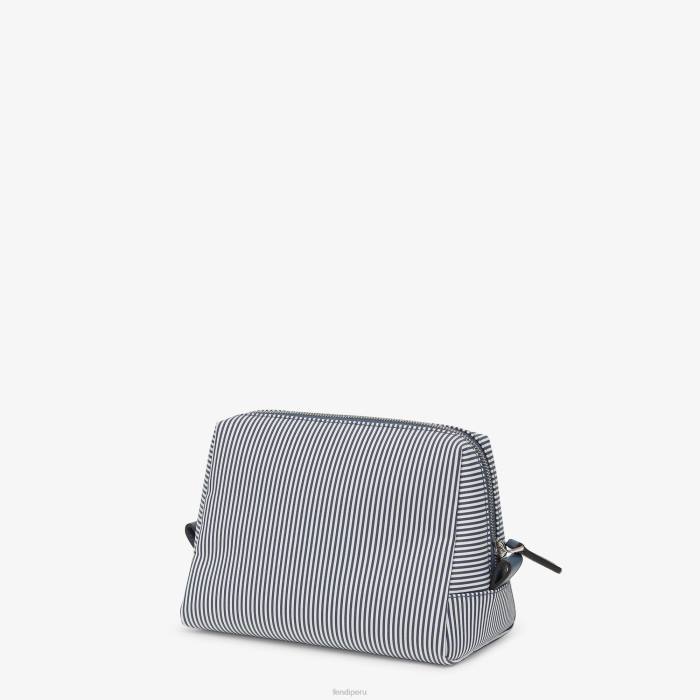 Neceser pequeño con cierre de cremallera y bolsillo interior. confeccionado en una tela de rayas blancas y azules. adornado con letras fendi y detalles de cuero azul. Artículos metálicos con acabado en paladio.