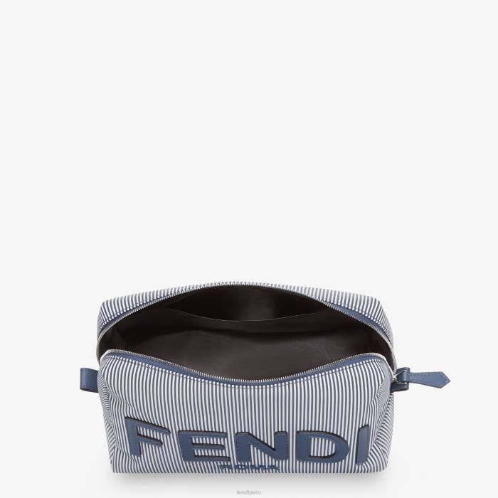 Neceser mediano con cierre de cremallera y bolsillo interior. confeccionado en una tela de rayas blancas y azules. adornado con letras fendi y detalles de cuero azul. Artículos metálicos con acabado en paladio.
