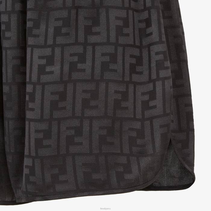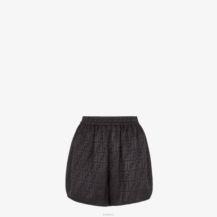 Pantalón corto con cintura elástica y aberturas laterales en el bajo. Confección en crepé de seda negro con motivo ff en jacquard por toda la prenda.