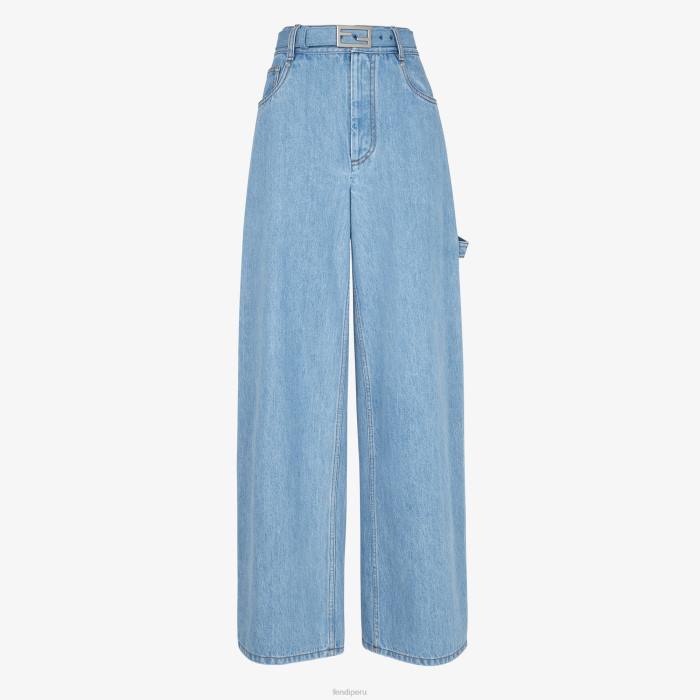 Pantalón de cinco bolsillos. Modelo de pernera ancha y cinturón a juego en la cintura con hebilla baguette ff esmaltada al tono. cierre de cremallera. Confeccionado en denim azul ligeramente descolorido. forro personalizado con motivo ff.