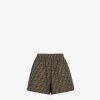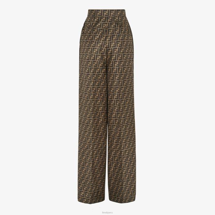 Pantalón palazzo entallado y de talle alto. Raya planchada, bolsillos laterales insertados y bolsillos traseros ribeteados. Cierre con cremallera oculta y pequeño gancho. confección en sarga de seda con motivo ff estampado íntegramente en marrón.