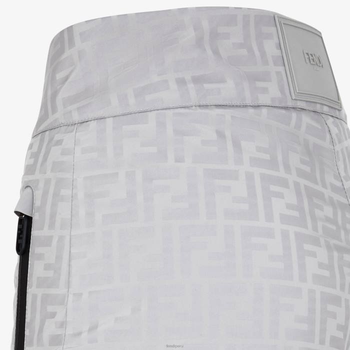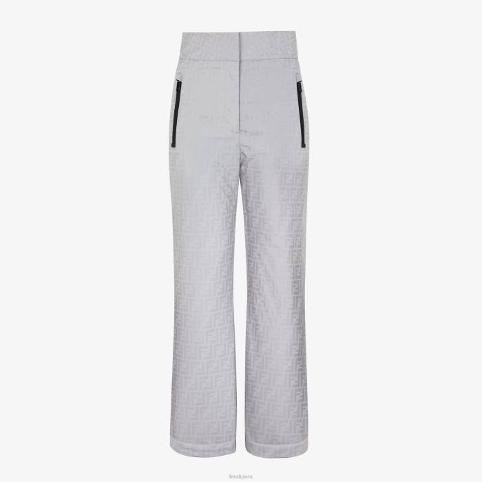 Pantalón de esquí de cintura alta con bolsillos con cremallera. Cierre de cremallera y botón ocultos. Confección en tejido técnico gris con motivo ff estampado por toda la prenda a juego. adornado con una maxietiqueta gris de Fendi aplicada en la parte posterior de la cintura.