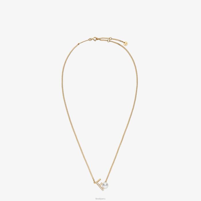 Collar fino con colgante con el primer logotipo de Fendi. fabricado en metal con acabado dorado. decorado con cristales talla baguette y perlas bijou blancas.