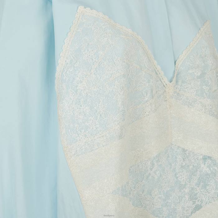 Camisa oversize con detalle trompe l’il en la parte delantera, hombros caídos y manga larga. dobladillo redondeado. cierre de botón cubierto. Confección en popelín de algodón azul claro con panel frontal de encaje blanco.