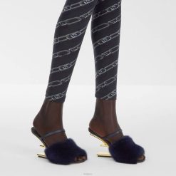 Primeras sandalias fendi con banda ancha y correa. hecho de visón azul. acabado con detalles de piel tono sobre tono. Tacón esculpido en forma de F diagonal de metal dorado.