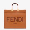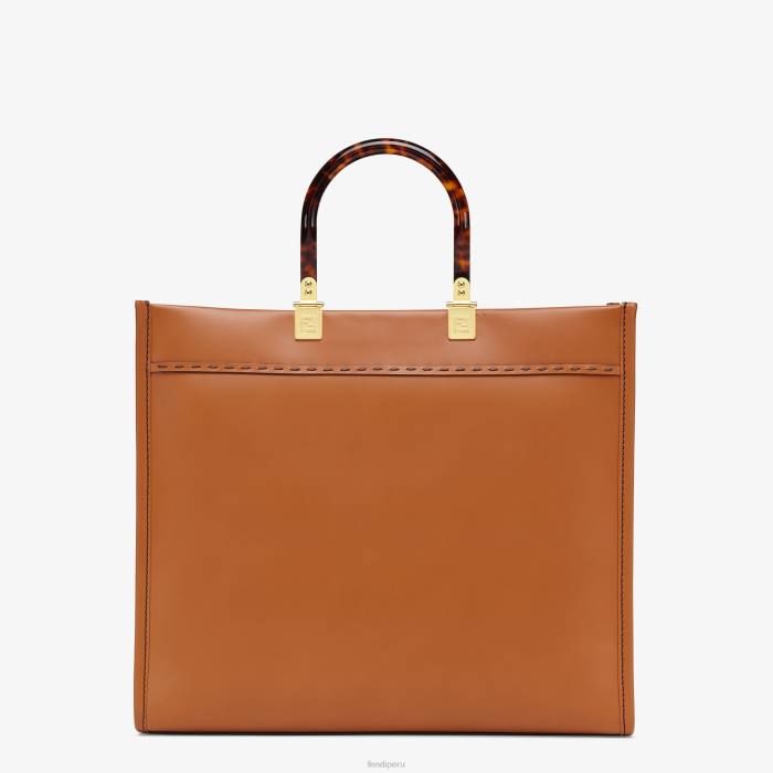 Bolso shopper mediano Sunshine confeccionado en piel marrón con estampado “fendi roma” termoestampado y asas rígidas de plexiglás en carey.