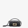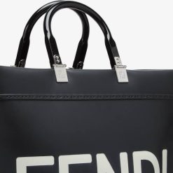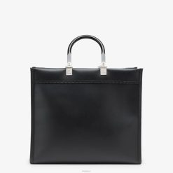 Bolso shopper mediano Sunshine confeccionado en cuero negro con letras fendi roma blancas estampadas en caliente y asas rígidas de plexiglás negro.