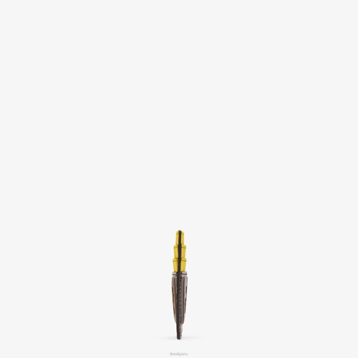 Es un tarjetero fendi con compartimento central y seis ranuras para tarjetas. acabado con el logotipo de Fendi Roma y una etiqueta interna. Confeccionado en cuero crucero martillado de color amarillo. acabado con motivo ff en relieve y pintado a mano.