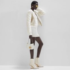 Bolso tipo cartera pequeño de líneas curvas y femeninas confeccionado en piel blanca. adornado con detalles y bordes en relieve y logo ff en la solapa.