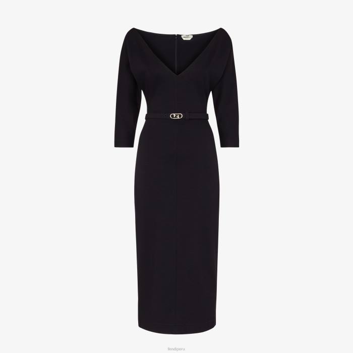 Vestido midi entallado con amplio escote en pico y manga tres cuartos. confeccionado con tejido de punto de lana negro. cinturón a juego con hebilla fendi o’lock de metal.