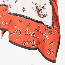 Caftán fluido con escote redondo y escote en pico en la parte delantera. mangas largas. confección en sarga de seda naranja y blanca, personalizada íntegramente con el estampado astrología fendi.
