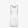 Vestido corto sin mangas con cuello mao. la silueta está definida por los grandes paneles fluidos estilo fular en la parte delantera. Cierre frontal oculto. Confeccionado en sarga de seda en colores azul y blanco. personalizado con un estampado integral con motivo astrológico fendi.
