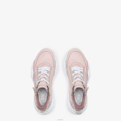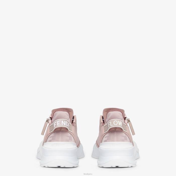 Zapatillas Fendi Flow con cordones elásticos ajustables y cierre de cremallera lateral. Personalizado con lengüeta de goma con logo grabado en la parte posterior del talón. fabricado en piel rosa. Detalles de tejido ff tono sobre tono. Suela running de goma de 35 mm con detalle de f diagonal blanca.