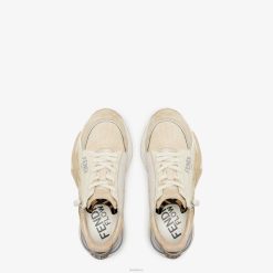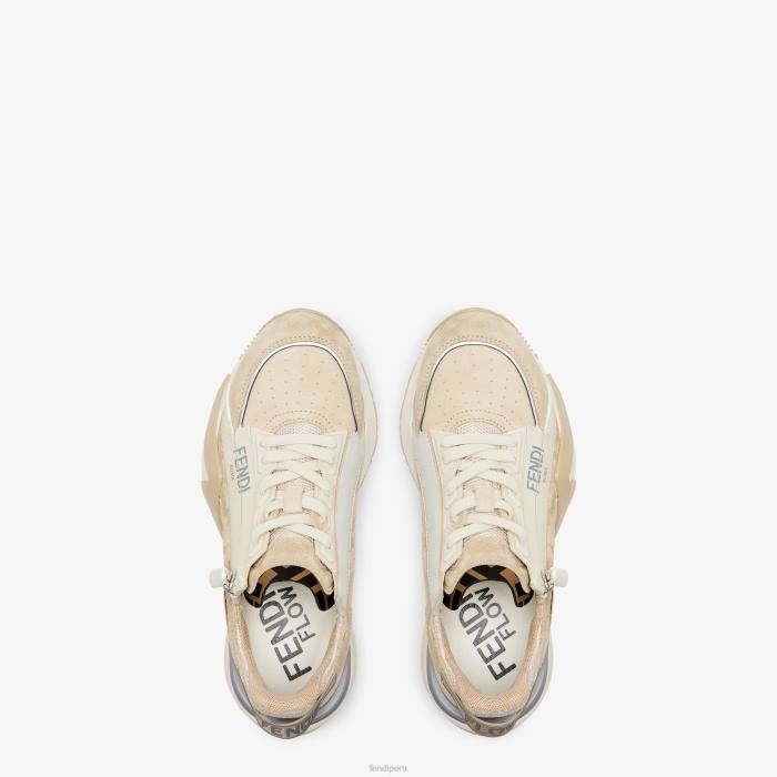 Zapatillas slip-on con cordones elásticos, cremallera lateral y suela ondulada con f grabada. Letras Fendi Flow grabadas en los talones. Confección en ante beige con inserciones de tejido técnico. adornado con detalles de lycra con motivo ff. Suelas ligeras de goma blanca con detalle de f diagonal beige.