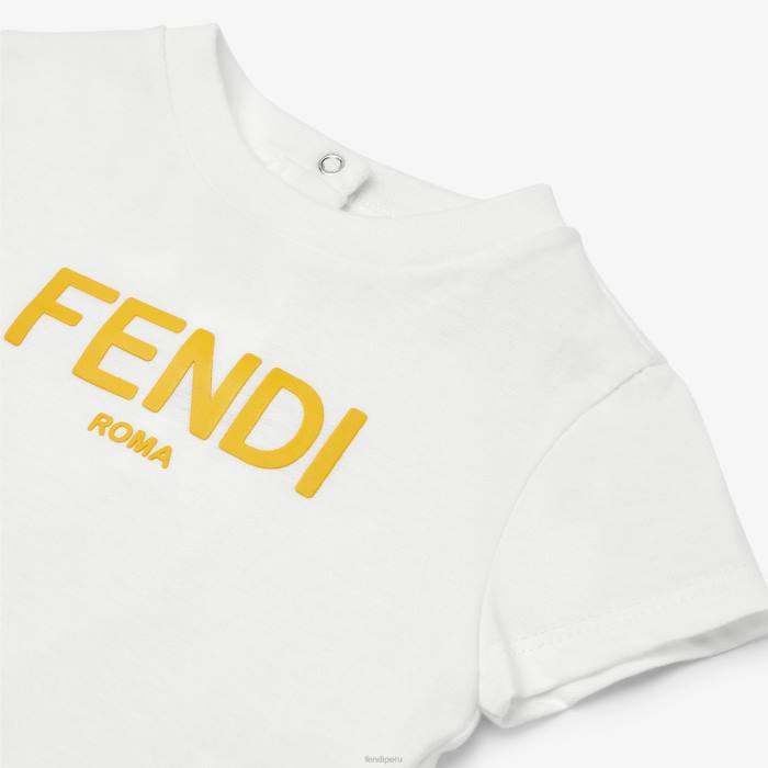 Camiseta de bebé de punto blanco con estampado fendi roma amarillo y abertura a presión.