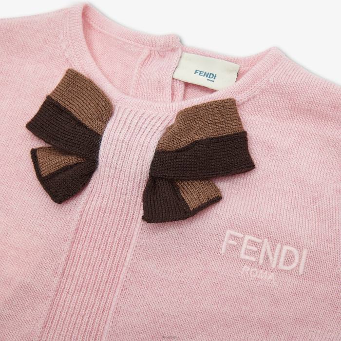 Cárdigan de bebé de punto de lana rosa con bordado fendi tono sobre tono y lazo tabaco.