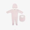 Conjunto para bebé de algodón acolchado ff tono sobre tono azul claro con babero, gorro y pelele con cierre frontal y borde con logo ff estampado.