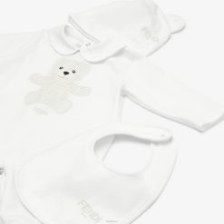 Conjunto para bebé de punto blanco con babero y gorro y estampado de osito 3D tono sobre tono en la parte delantera.