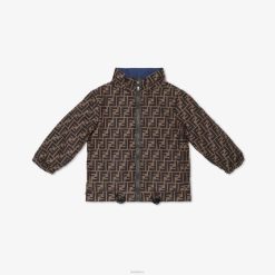 Plumífero ligero reversible para jóvenes de nailon con cuello redondo. azul marino liso en un lado con bandas con el logo ff en las mangas, el otro lado presenta un estampado ff en tabaco por toda la prenda.