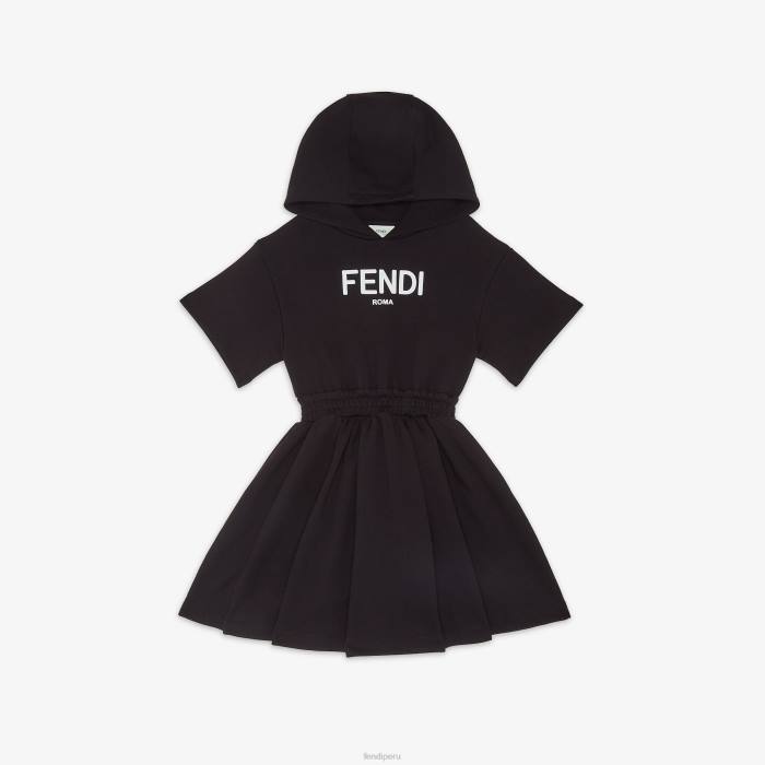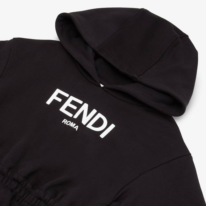 Vestido junior de forro polar, con capucha y cinturilla elástica. recorte en la espalda y estampado fendi roma blanco en la parte delantera.